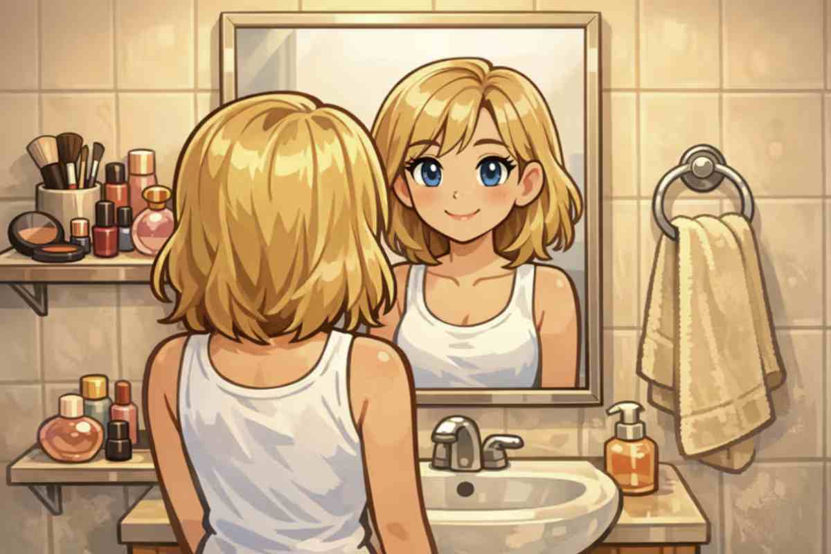 Un’immagine apparentemente semplice, una scena quotidiana come tante: una giovane donna in bagno, oggetti familiari, un ambiente ordinario.
